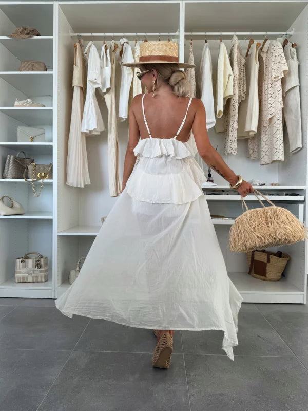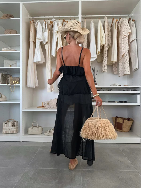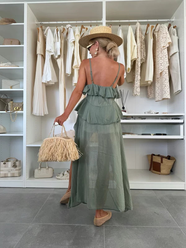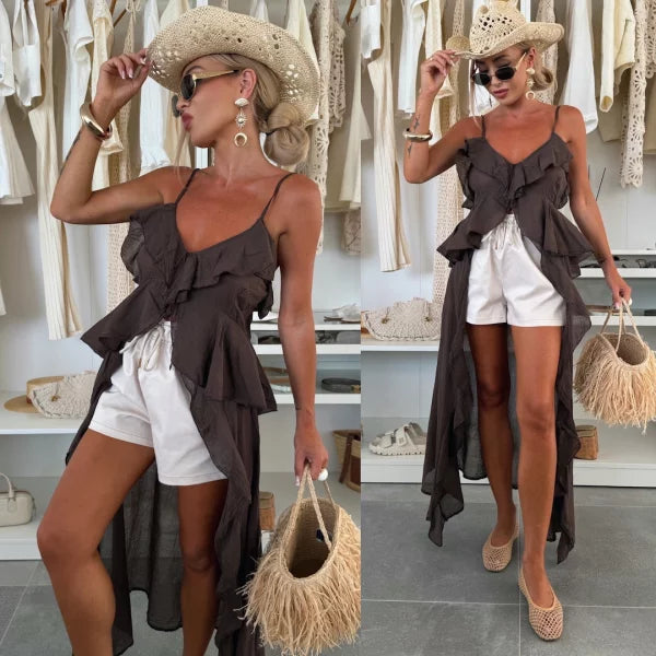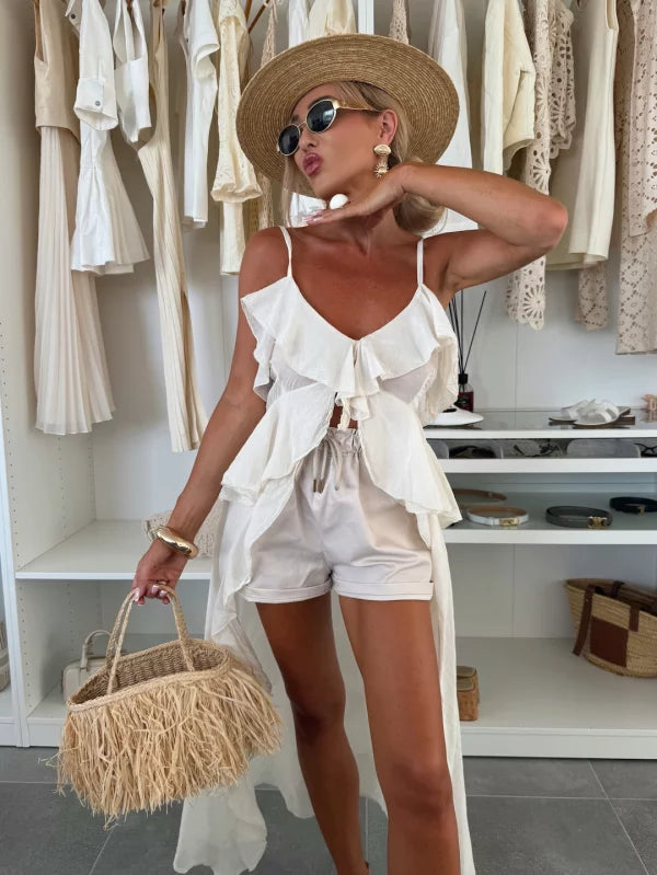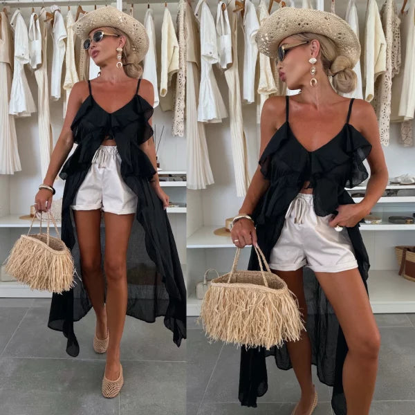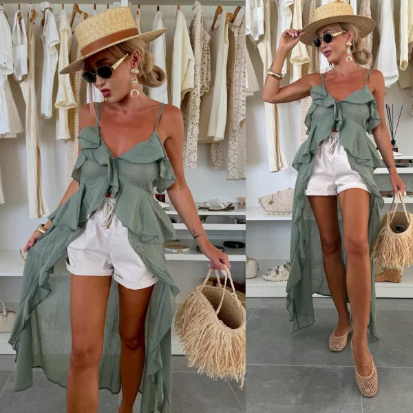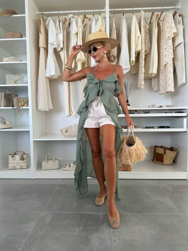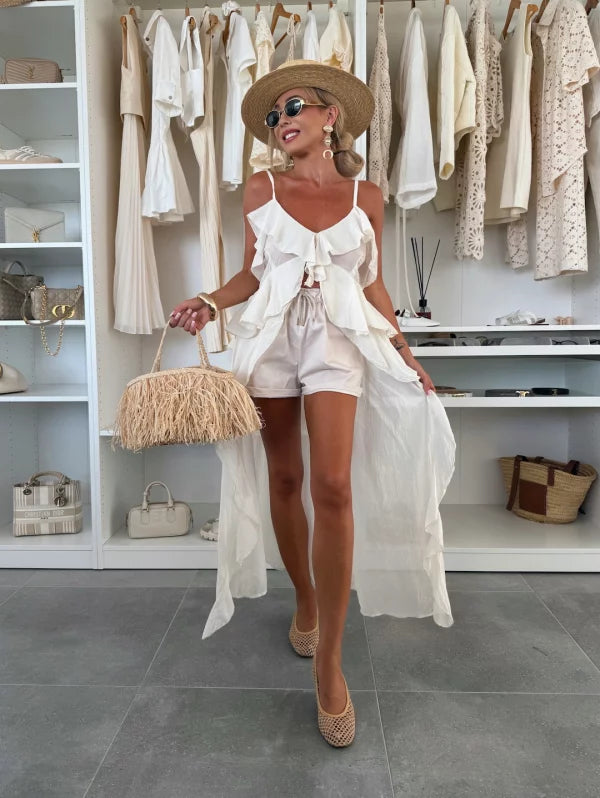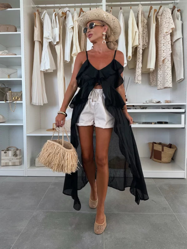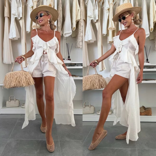 A beach ensemble that combines comfort and style in a perfect vacation look. Designed for sunny days, it enhances the silhouette, catches the eye with golden details and brings a touch of elegance to any look.