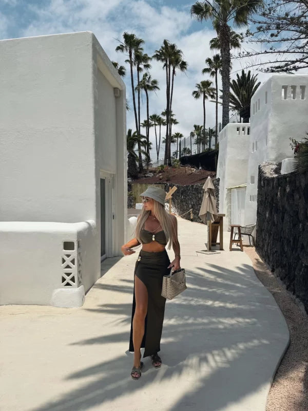 Un completo da spiaggia che unisce comfort e stile in un perfetto look da vacanza. Pensato per le giornate di sole, esalta la silhouette, cattura lo sguardo con dettagli dorati e dona un tocco di eleganza a ogni look. Perfetto per la spiaggia, le passeggiate estive o una cena al mare.