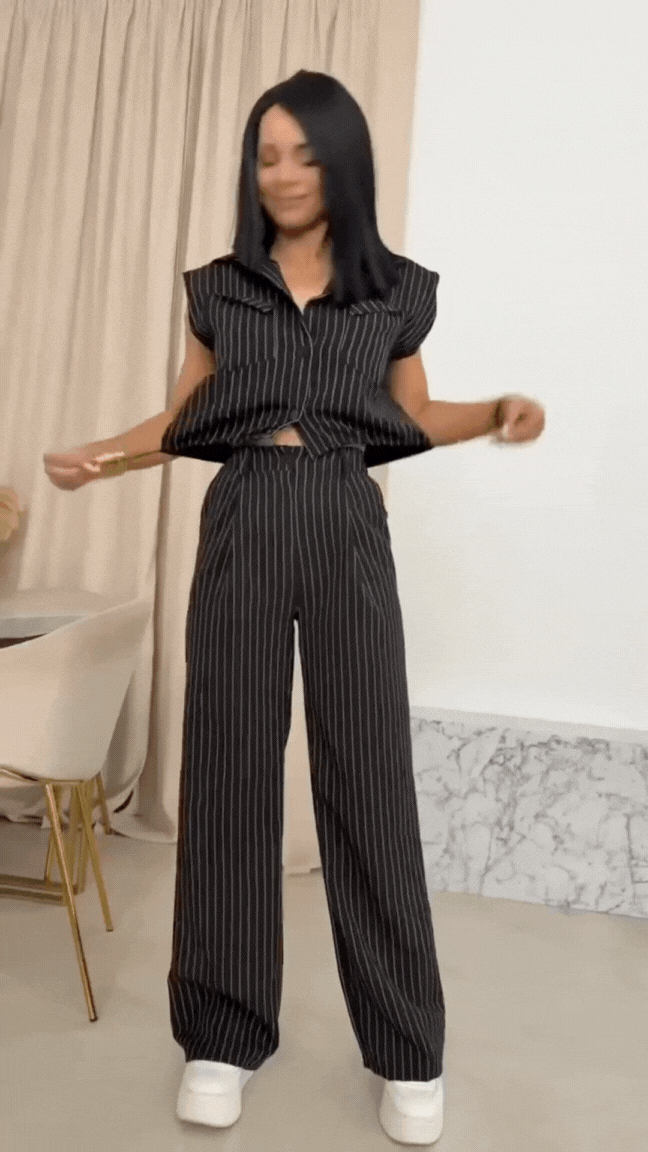 Velluto Nero è il taullier che unisce il comfort alla grazia quotidiana. Realizzato in un tessuto arioso e strutturato, presenta una camicia oversize con tasche frontali e maniche morbide, abbinata a pantaloni ampi con vita elasticizzata, ideali per ogni movimento. Le righe verticali sottili donano slancio alla figura e un tocco raffinato anche nei momenti più semplici. Un completo che si adatta a ogni stile e a ogni colore della tua giornata.
